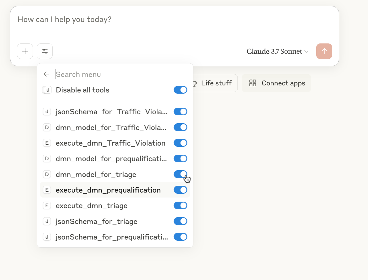 You can see the tools that are available for usage with your Claude Desktop which can include getting the schemas of the DMN and also for executing them.