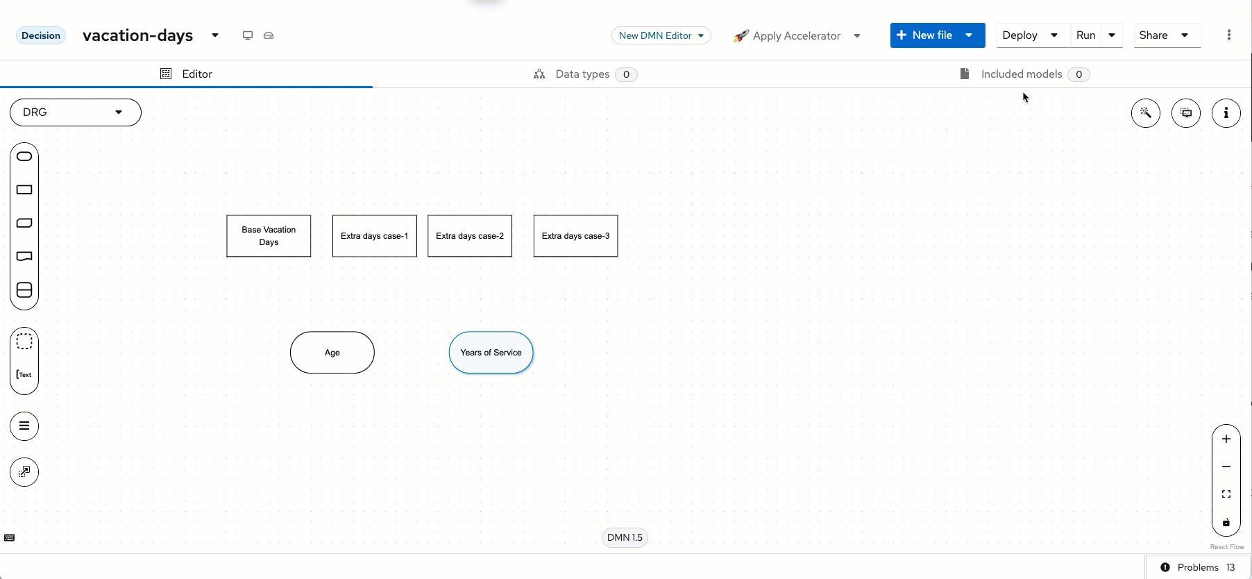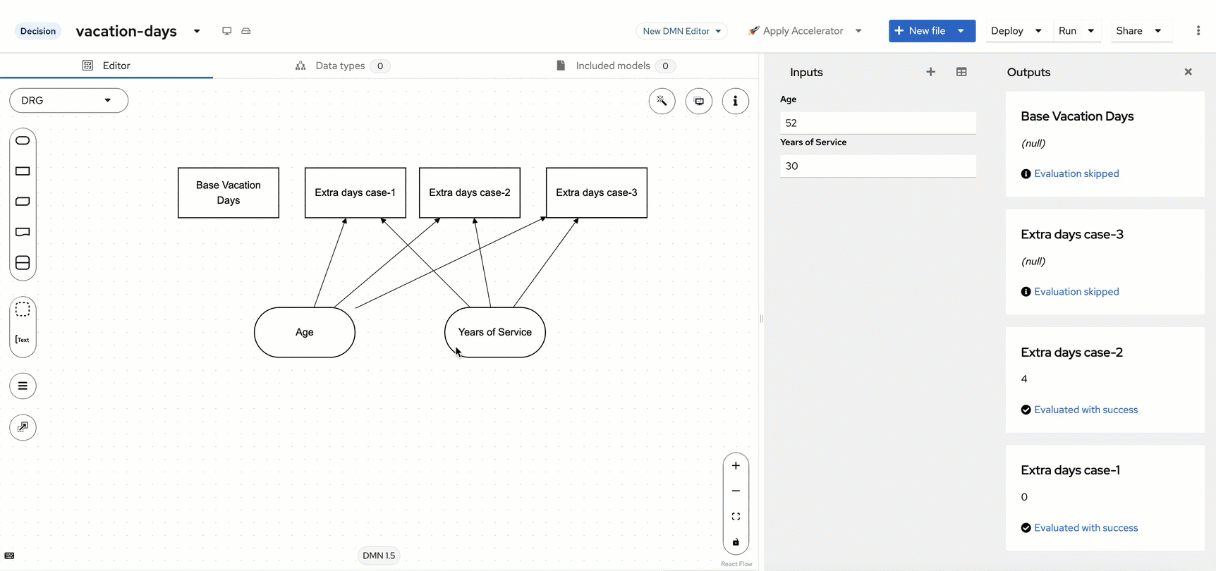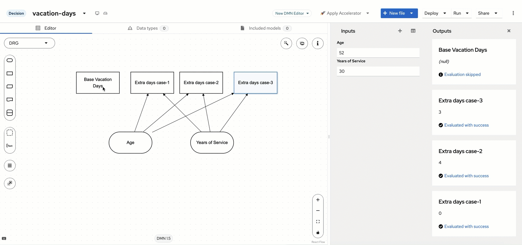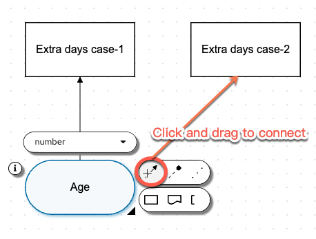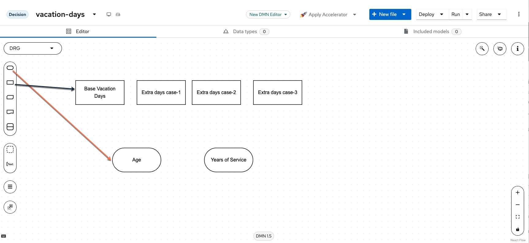 Now we need to connect the Age and Years of Service input nodes to our Extra days case-1, Extra days case-2 and Extra days case-3 decision nodes (note we’re not connecting to Base Vacation Days and this will be explained later!). A good practice with DMN model design that Aletyx Playground allows is the use of the DMN Runner to see how your model is evolving while you’re working on it. If you press Run just above the editor, you will start seeing the model interact as the model changes. To do this, when your cursor hovers over the input node (Age or Years of Service), you will see an icon that is an arrow, this is the Information Requirement arrow that we will use to make it so that the Extra days case-1, Extra days case-2 and Extra days case-3 cases all require both the Age and Years of Service inputs.