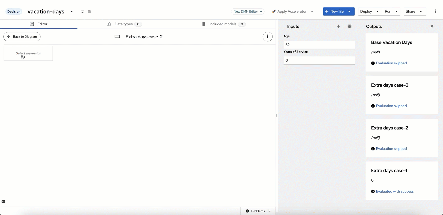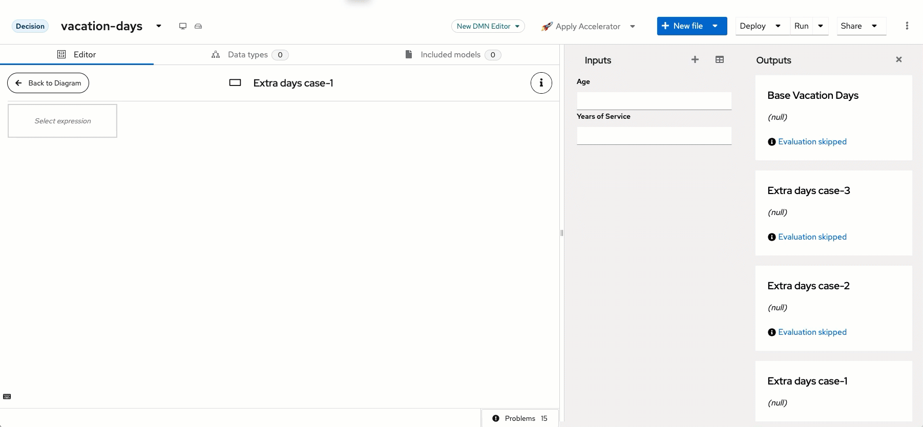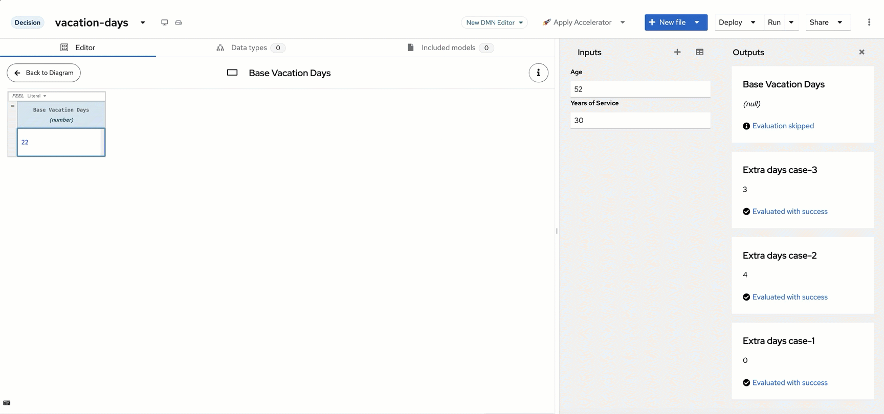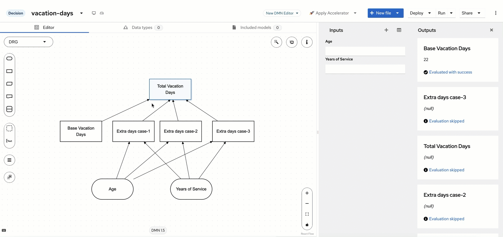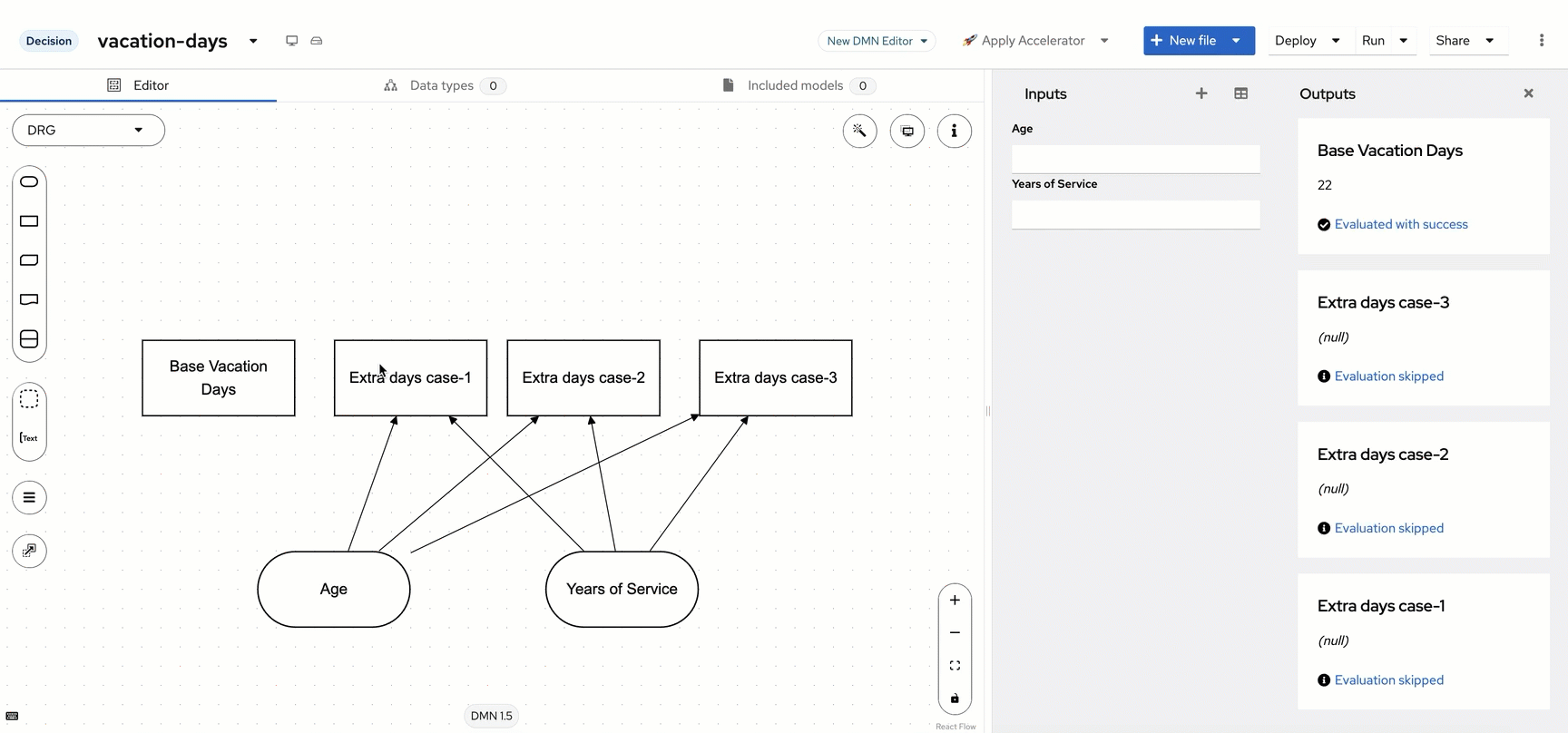 Bringing the decisions together You will notice that after the 22 is put in on the previous decision, that it executes the Base Vacation Day decision as soon as it is completed. This is because this decision has no requirements on the age or years of service, if you were to delete the data from Age and Years of Service, the decision for Base Vacation Days would remain at 22 and the others would return null as the data is assumed to be null/empty in this situation. This is the power of DMN at work, the decisions that can be made at the time of execution will be made based on the requirements met. So as more data is obtained (Age/Years of Service), the nodes attached to it will be executed since their requirements are met. However, now that we have these nodes all executing, we would like to get to a final decision that is made when the 4 components of the decision are executed.