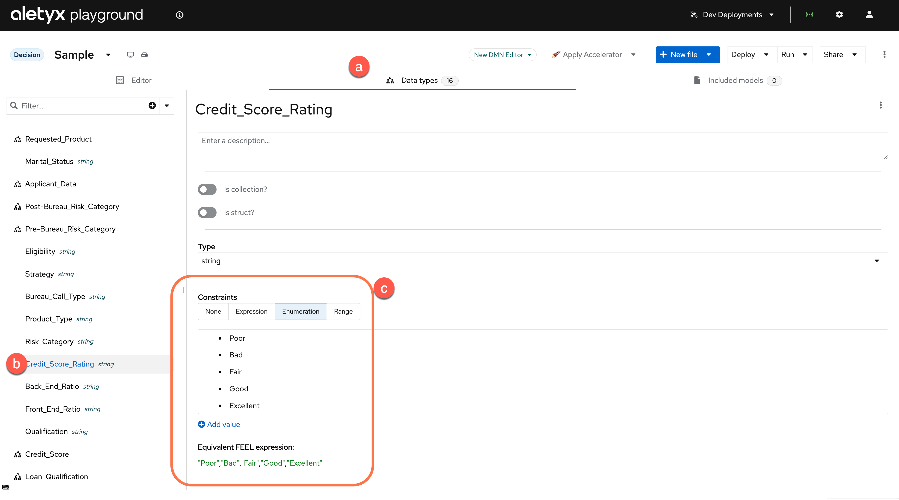 Decision EditorThis section of the DMN editor is currently activated and showing the DMN model or a selected.Decision ConnectorsFrom a given decision, you can either connect with the various lines to their appropriate types or connect another decision or knowledge source.Decision Output TypeThe pulldown allows you to map your decision's datatype to a particular part of your model and/or structures.Data Types EditorThis section of the DMN editor allows you to view, create, or edit data types associated with the model.Included ModelsThis section of the DMN editor allows you to reference other models for your DMN model. An included model allows decision/model/data object reuse easily.Credit Score Rating Decision NodeThe rectangle on the DMN editor represents a Decision Node. In this case it is used for representing the Credit Score Rating based on an input of Credit Score. This is data that would be required to execute the decision.Credit Score Input NodeThe oval on the DMN editor represents an Input Data Node used for the applicant's credit score. This is data that would be required to execute the decision.DRG Node SelectorThis section of the DMN editor allow you to easily navigate the different Decision Requirement Diagram's nodes.AnnotationsAnnotations allow you to put various annotations on your DMN model, they have no executable impact, but are great for further explaining a model.Decision InputIn DMN, an Oval represents the input for a DMN model. These can be mapped to specific data structures or types.Decision NodeThe Decision Node is used to place a decision on the DMN requirement diagram. A Decision node with no inputs to it will execute on DMN invocation, if there is a requirement node (e.g. another Decision Node or Input Node preceding it), then it will require that to be completed before its requirement is met and thus execute the decision contained within it.Decision BKMA BKM allows use of Friendly Enough Expression Language (FEEL), Java or PMML models to be used to further supplement decision execution.Decision BKMA BKM allows use of Friendly Enough Expression Language (FEEL), Java or PMML models to be used to further supplement decision execution.Knowledge SourceDocuments, committees, regulations, policies or people that define how a decision should be made. They are not executable.Decision ServiceA Decision Service allows for decisions to be captured and exposed (or hidden) from execution.Edit DecisionClicking the edit below a decision's node when clicked allows you to edit the logic of the selected decision node.Properties of Selected itemClicking the i icon opens the selected node's properties to be opened. This can also be done by pressing the "i" key on your keyboard. -