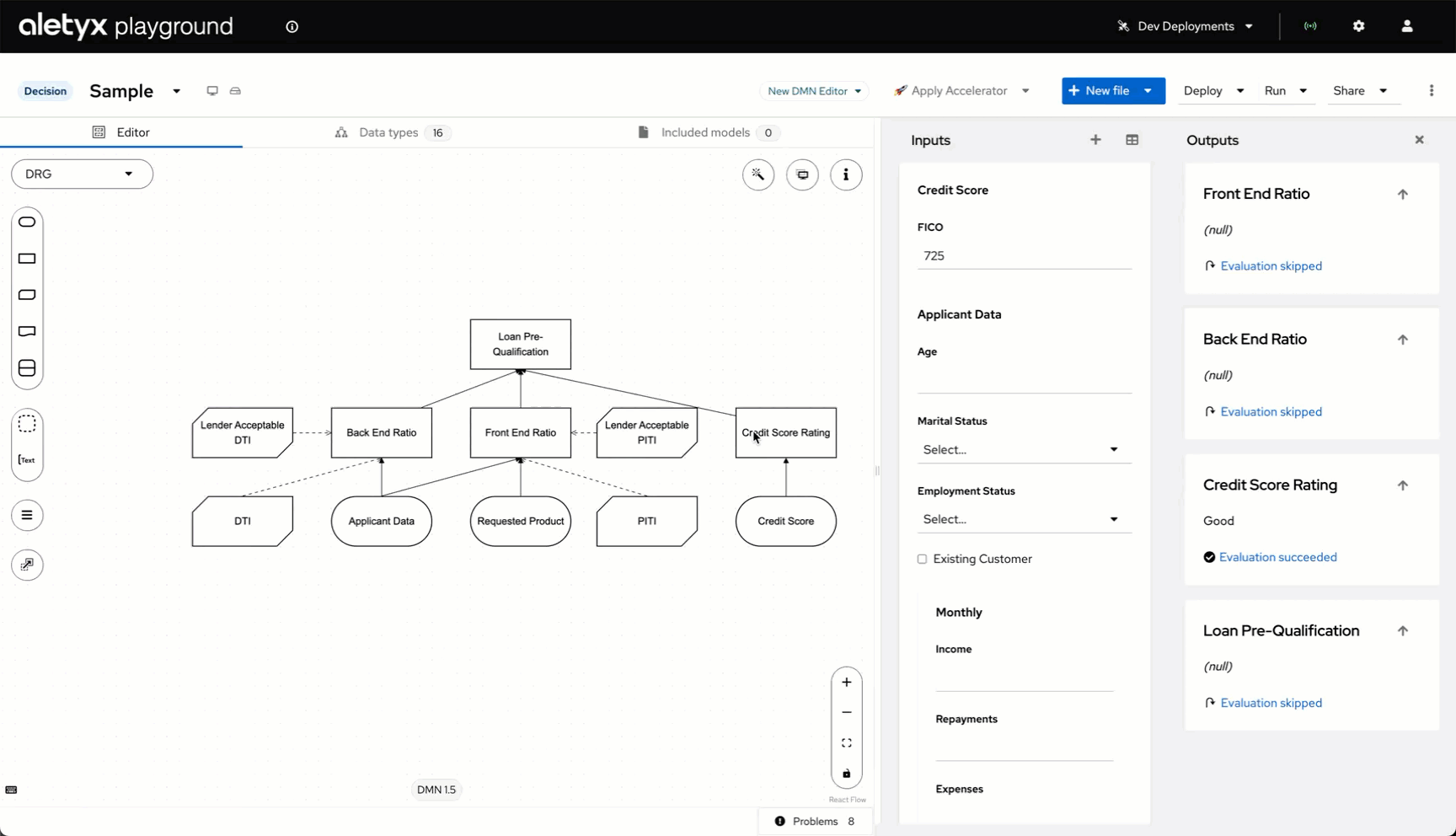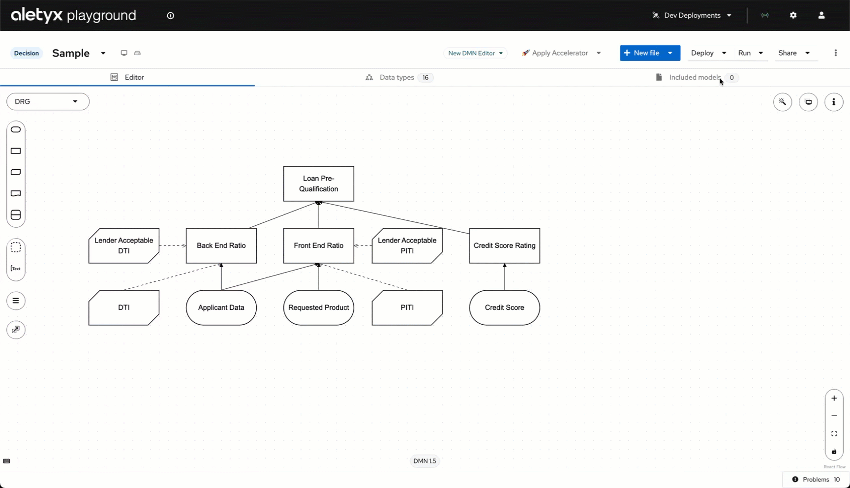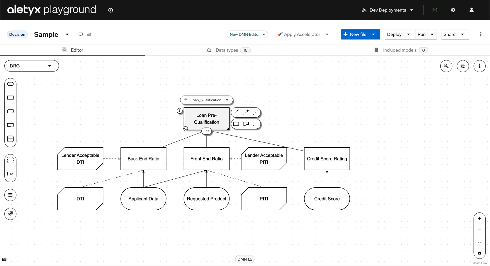 This opens a sample "Loan Pre-qualification" DMN model (DMN 1.5 Specification).