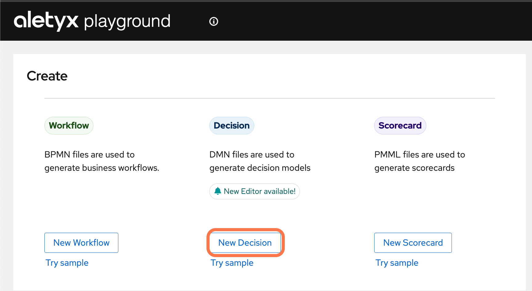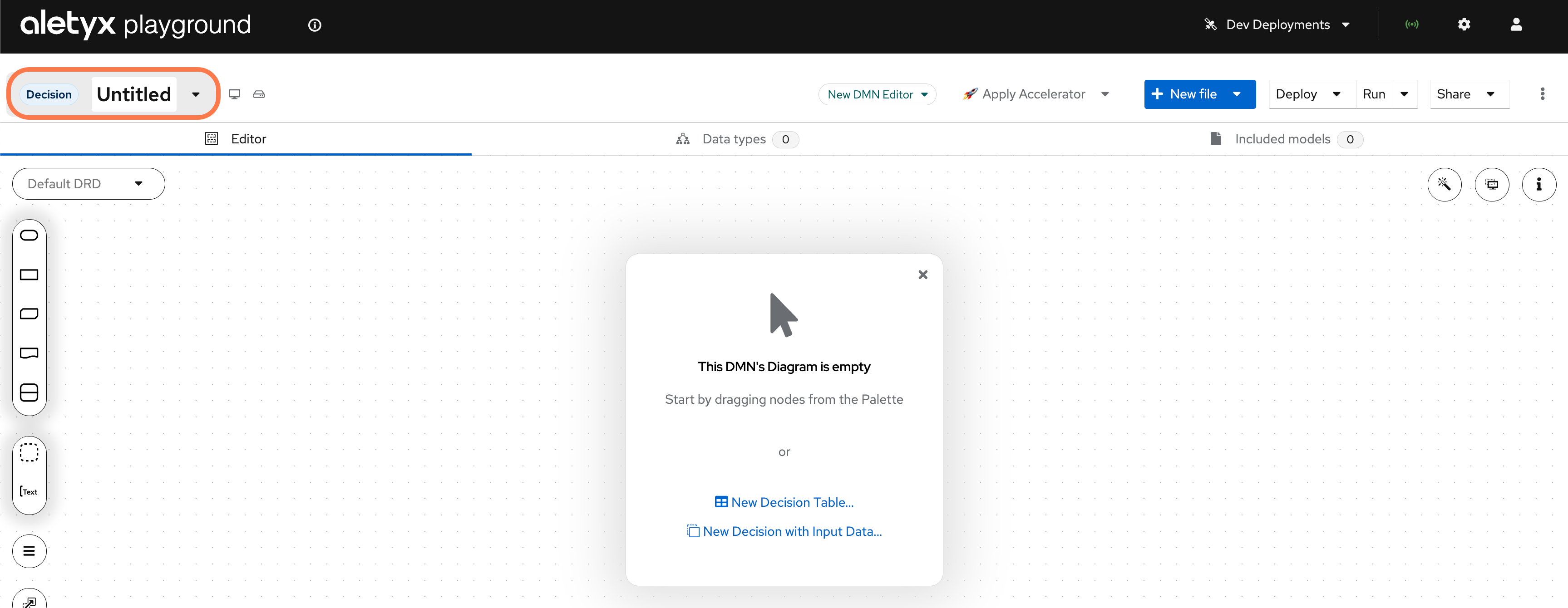 Return to the home screen and click New Decision. You can do this by clicking the Aletyx Playground logo.