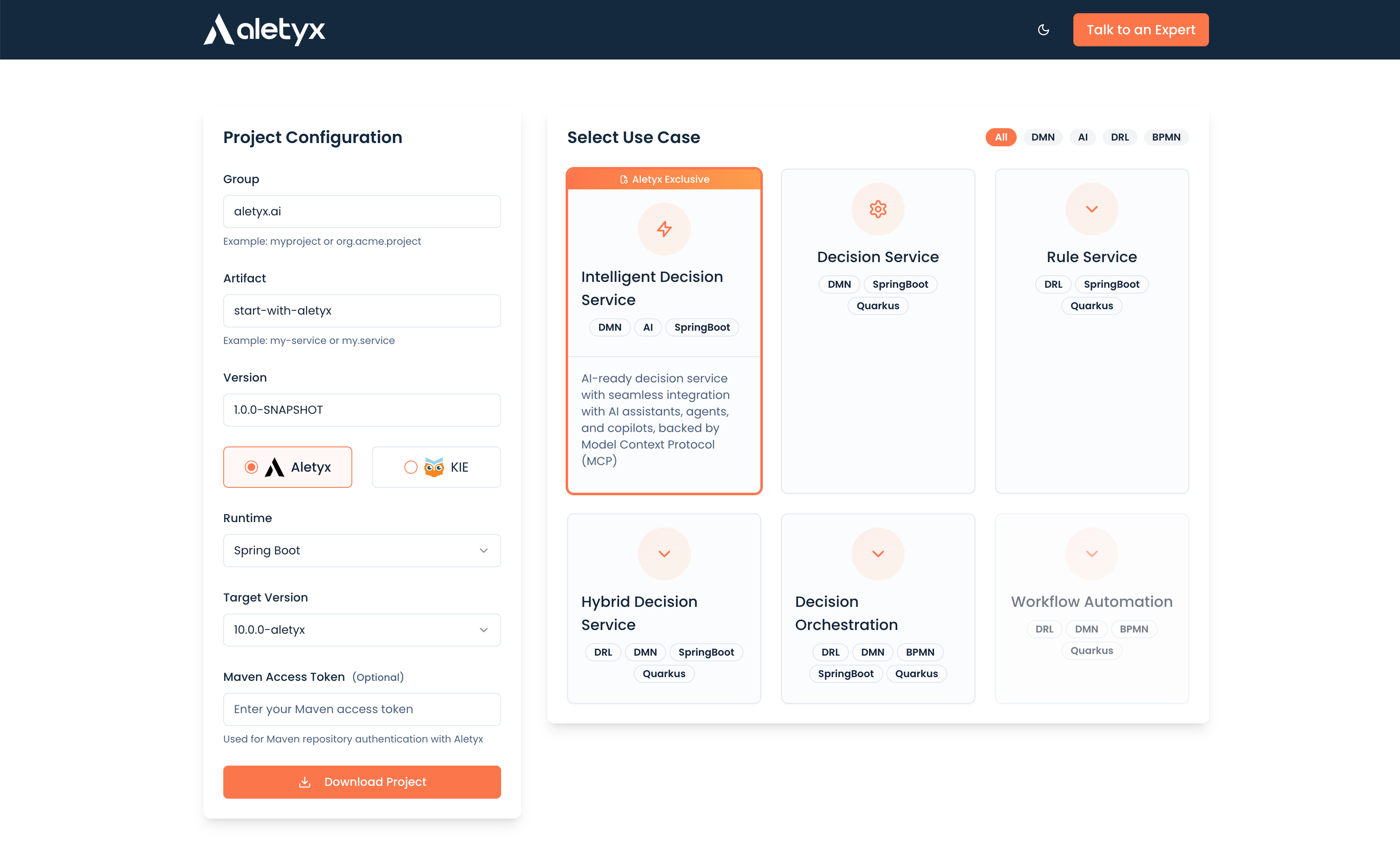 This guide will walk you through creating a new project using the Aletyx's project generator at start.aletyx.ai.